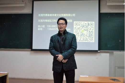本网讯 2016年12月17日晚,公司实习基地东莞市“爱蹦蹦床馆”推介会在教学楼G208顺利举办。商公司党委书记许志超、工管系主任丁浩副教授、工管系严红副教授、爱蹦蹦床馆总经理董开伟、施婉婉出席推介会。会议由丁浩主持。