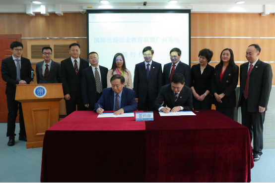 隋广军与王重鸣签署国际丝路创业教育联盟广州基地协议,并为国际丝路创业教育联盟广州基地揭牌。