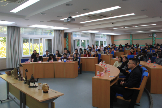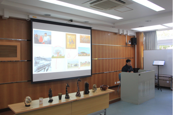 随后,傅朗大致介绍了非洲的总体概况,非洲人民的体态性格以及非洲音乐舞蹈的特点。紧接着,傅朗主任对非洲各国进行了详细介绍。他生动的图片,根据其收藏的木雕、泥塑、画作等藏品,并结合自身的外事经验与外事工作中的趣事讲述了“动物天堂”肯尼亚、“彩虹之国”南非、“非洲巴西”安格拉、“文明古国”埃及、“旅游天堂”塞舌尔、“北非花园”摩洛哥、“铜矿之国”赞比亚、“黄金海岸”加纳、“国小人富”的毛里求斯、“资源丰富”的坦桑尼亚、具有悠久多元文化的突尼斯、埃塞尔比亚和津巴布韦各国的独特的风俗习惯、饮食文化、产业状况等,语言幽默有趣,全场气氛十分活跃。