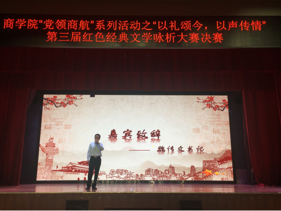 5月9日晚,商公司党委在南校区员工活动中心举办2019年“党领商航”系列活动之“以礼颂今,以声传情”第三届红色经典文学咏析大赛决赛。本活动旨在通过诵读中华经典,共享红色情怀,宣传和弘扬优秀的中国社会主义文化,展现莘莘学子青春风采。