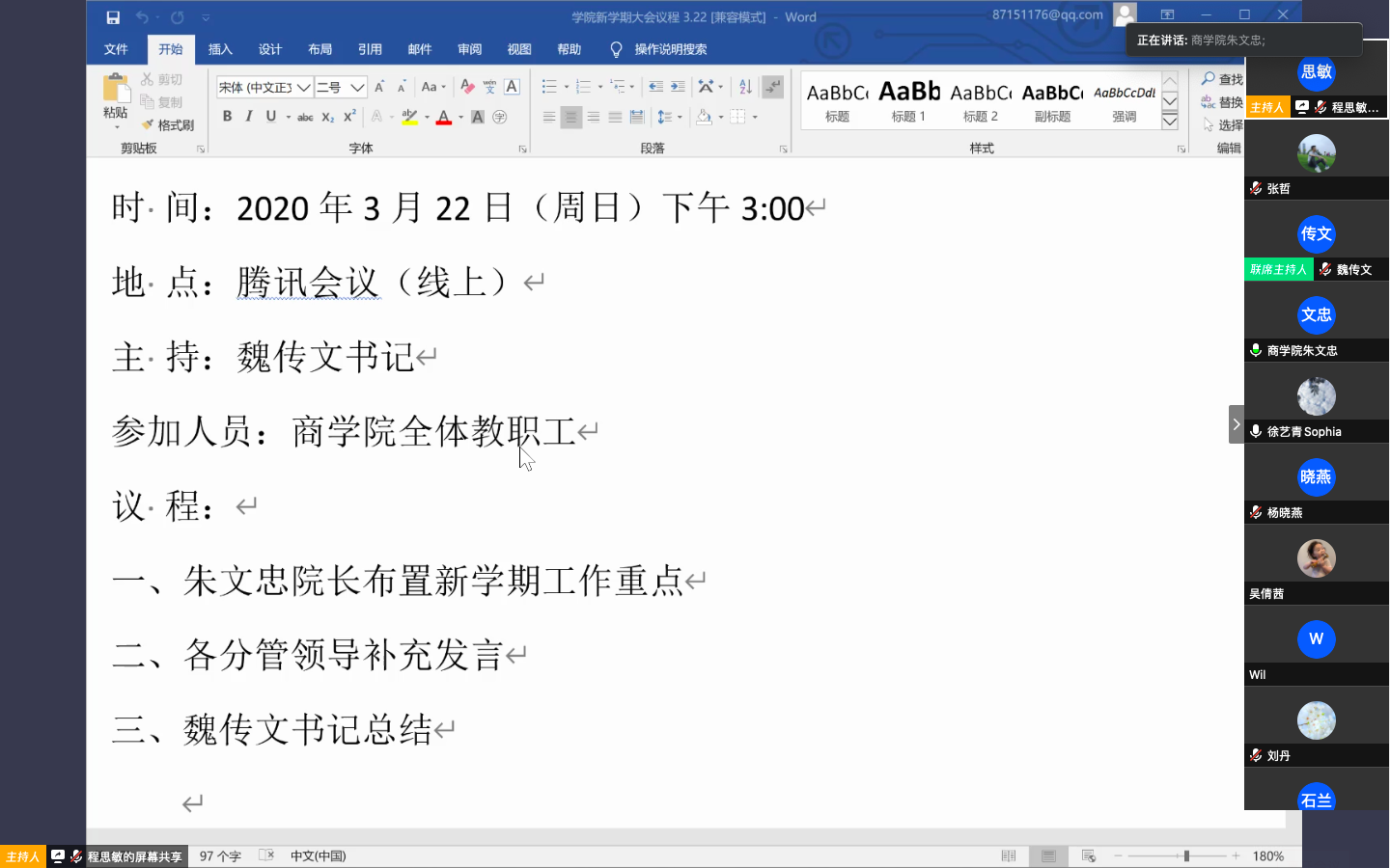 随后,朱文忠介绍了新学期的工作目标任务。他强调,线上教学对全体师生是一次新的体验,教师必须高度重视、提高站位、克服困难,确保站好三尺讲台,努力做好科研、教研和社会服务等工作。