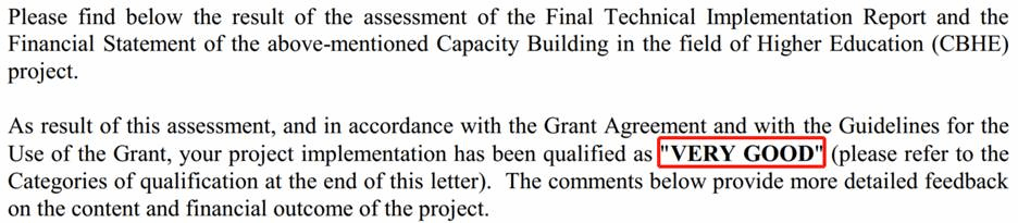 近日,公司收到欧盟委员会教育、视听与文化执行署(EUROPEAN COMMISSION - Education, Audiovisual and Culture Executive Agency, EACEA)对公司与欧盟合作的项目ERASMUS+LMPT的结项评估结果,该评估结果显示项目获得“VERY GOOD”(优秀)等级。据悉,EACEA对项目评估结果共分为四个等级,“VERY GOOD”是最优秀等级。公司作为中国区牵头大学,在欧盟伙伴大学的支持下,与国内兄弟院校共同合作,助力建设、发展中国的可持续旅游团队建设。该成绩是公司高水平大学建设和争创“双一流”高校的又一重要成果。