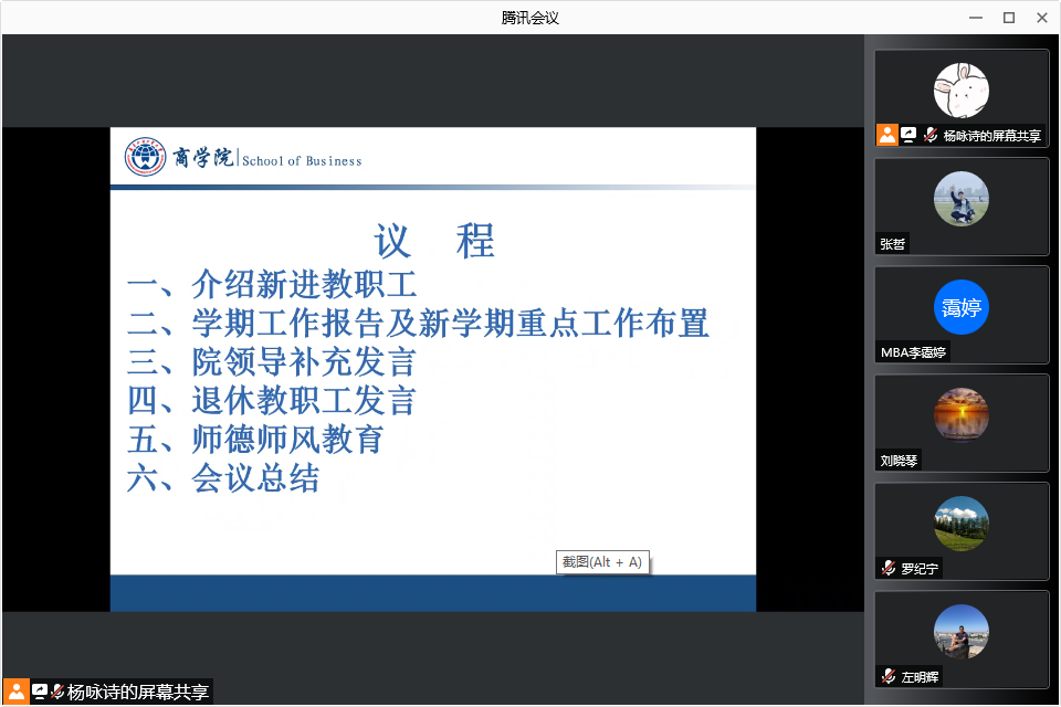 7月8日下午,威廉希尔体育2020-2021学年第二学期期末总结大会在线上召开。威廉希尔体育全体教职工出席大会。商公司党委书记魏传文主持大会。会议开始,魏传文介绍了新进教职工,并对他们的加入表示热烈欢迎。