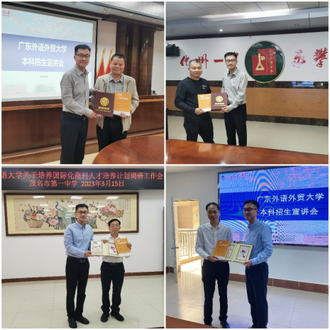 为落实公司对2023年招生宣传工作的要求,确保各项招生宣传任务有力推进,3月13日—15日,商公司党委书记肖喜明带领副经理曾楚宏、副书记沈长霞、人力资源管理系教师陈国海、工商管理系教师周宇、辅导员黄冠富一行赴茂名地区开展招生宣传活动。同行的还有公司员工事务与合作发展处冯思军。本次招生宣传主要深入到高州中学、化州一中、茂名一中和电白一中等四所中学,分别举行了座谈会和专题讲座。