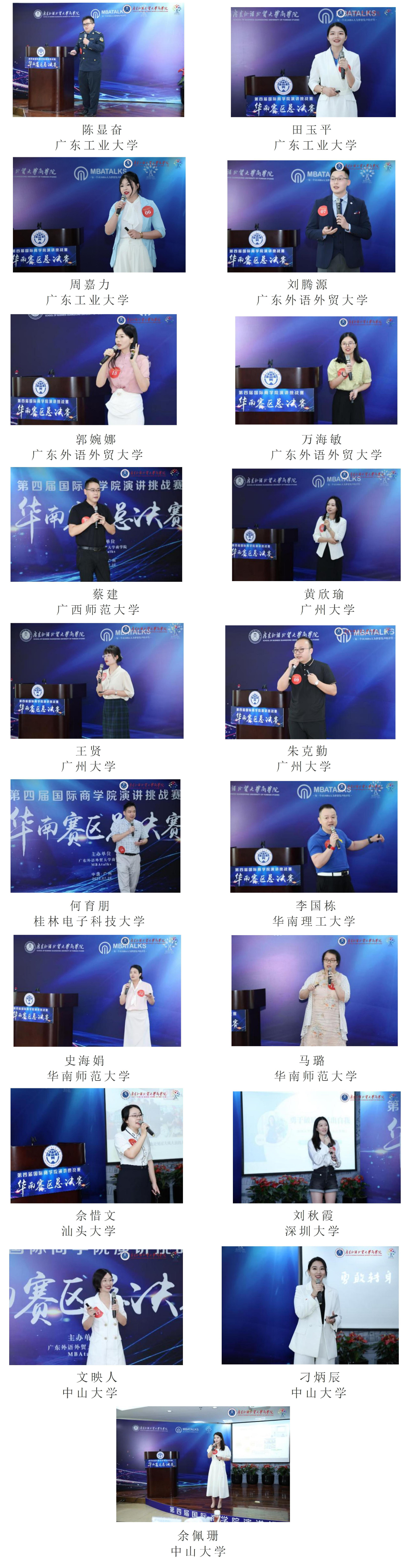 第四届国演赛华南赛区总决赛邀请组建了阵容豪华的评委与嘉宾:珠海市演讲与口才协会创会会长、中国演说家俱乐部副主席、中国南方人才市场教培中心职场口才系列课程总培训师谭文浩;国际威廉希尔体育演讲挑战赛执行主席钱多多;广州市委讲师团副团长、公职律师艾希繁;《长江品牌计划》专家组成员、绿野资本大中华区合伙人、MBAtalks副秘书长郑冉;第六届中国MBA华南峰会理事长、香港浸会大学MBA中国员工会联席主席范家琪;威廉希尔体育第四届国际威廉希尔体育演讲挑战赛(华南赛区)推广大使中国MBA峰会华南副理事长徐健君;以及广州大学MBA教育中心员工与员工事务部负责人马俊健。