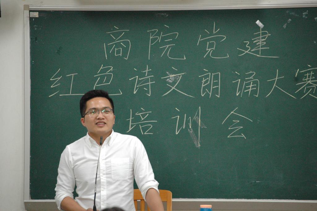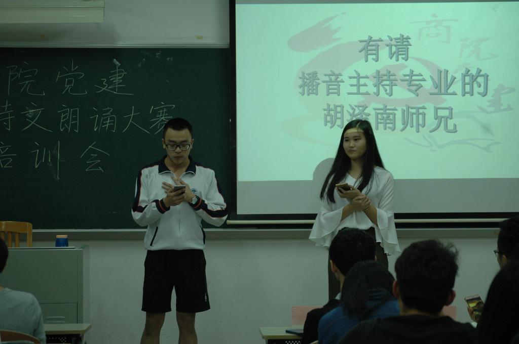本网讯 3月21日晚上9:30,由商公司党委主办的“党旗领航·筑梦飞扬”系列活动之红色诗文朗诵大赛培训会在教学楼F203成功举行,商公司党建指导老师殷毅山、新闻公司播音主持专业的胡泽南同学以及19支参赛队伍出席了本次培训会。