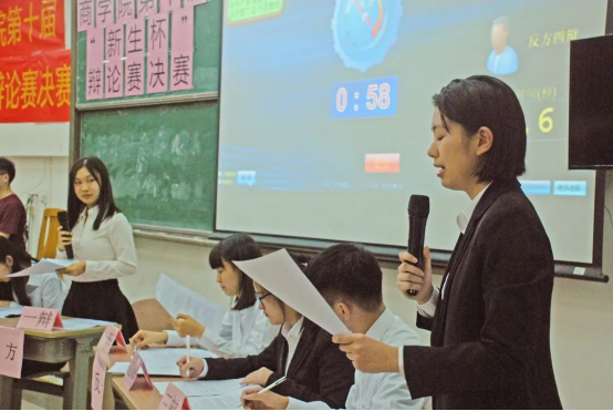 冠军赛伊始,赵问源作为嘉宾代表发言,她先对给予本次活动支持的各位老师和为活动策划和组织付出辛劳的商院团学致以诚挚的感谢,随后引用《奇葩说》选手熊浩在演讲比赛中的陈述言明辩论与人们的生活息息相关,生活像辩题一样不可预测,人们总是不可避免地遇到与自己价值观不一样的情况,而辩论让人们懂得如何为自己的立场发声,同时,也让人们学会以更加包容的心态看待社会,聆听更加多元的声音。