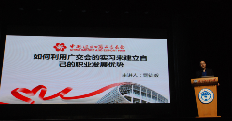 为了让同学们更深入了解广交会,广交会代表、中国对外贸易中心人事处培训发展事务科副科长司徒毅详细介绍了广交会的发展历史及变化、展区的分类和广交会期间的一些相关活动。除此之外,司徒毅还开展了主题为“如何利用广交会来建立自己的职业发展优势”的专题讲座,他认为,作为一名优秀的老员工,我们应当用战略眼光进行职业规划,并锻炼自己的工作能力、意志力和沟通协调能力。