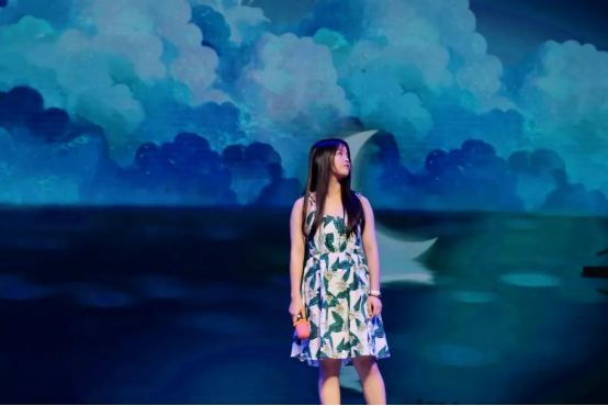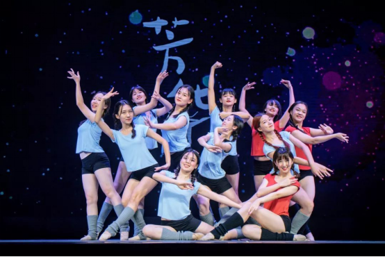 民舞队在暖场过后翩然登场,蓝与白相间的舞蹈让人赏心悦目,青春演绎“星并不远梦并不远只要你踮起脚尖”。